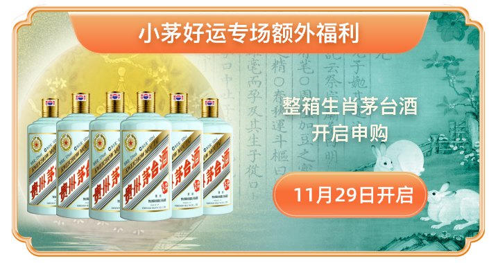 “小(xiǎo)茅好運”專場(chǎng)升級 2023年11月29日起,在4款享約申購産品的基礎上(shàng),小(xiǎo)茅将在“小(xiǎo)茅好運”專場(chǎng)中加入該年整箱500ml貴州茅台生(shēng)肖酒,作(zuò)為(wèi)本命年用戶的額外福利,符合“小(xiǎo)茅好運”專場(chǎng)條件和(hé)當年生(shēng)肖屬相的親可(kě)以參與申購該産品。希望小(xiǎo)茅的這份心意,能為(wèi)親們帶來(lái)獨特的收藏體(tǐ)驗和(hé)情感回憶。