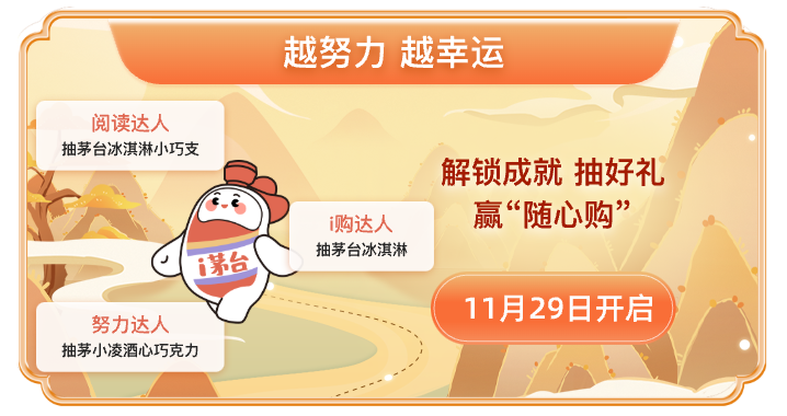 越努力 越幸運 11月29日-12月27日,小(xiǎo)茅将開(kāi)展“成就”任務獎勵活動,共設置“閱讀達人(rén)”“i購達人(rén)”“努力達人(rén)”三個(gè)“成就”任務,每解鎖完成一個(gè)“成就”任務即可(kě)在指定時(shí)間(jiān)獲得(de)1次抽獎送好禮機會(huì),小(xiǎo)茅準備了“小(xiǎo)巧支”、茅台冰淇淋、茅小(xiǎo)淩酒心巧克力等千萬禮品等您抽取。率先完成全部“成就”任務的前50000名用戶,還(hái)可(kě)參與“随心購”專場(chǎng),專場(chǎng)投放貴州茅台酒(珍品)、貴州茅台酒(癸卯兔年)500ml、茅台1935酒×2瓶、100ml貴州茅台酒(i茅台)×2瓶等4款産品,供符合條件的親們購買。