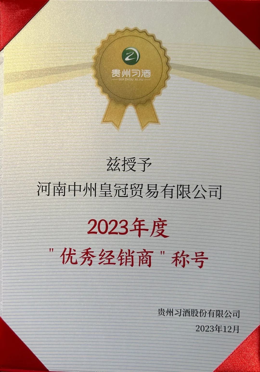 喜訊‖中州皇冠貿易榮獲“貴州習酒2023年度優秀經銷商”稱号