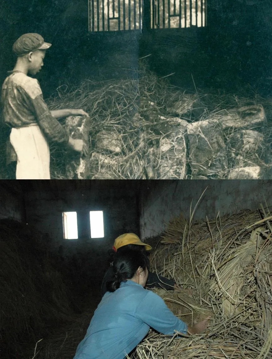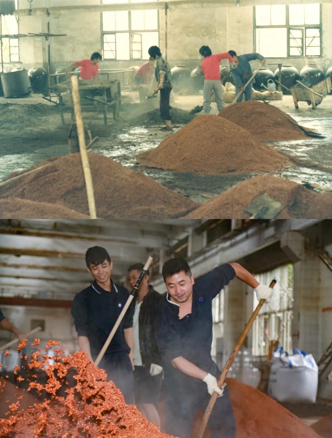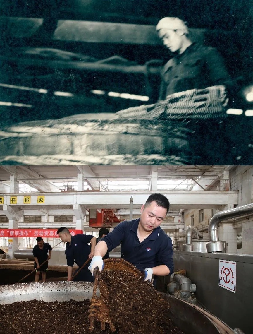 上(shàng)圖為(wèi)20世紀50年代拆曲出倉場(chǎng)景;下圖為(wèi)當前工人(rén)正在曲倉進行(xíng)翻倉操作(zuò)。茅台堅持高(gāo)溫制(zhì)曲,大(dà)曲在曲倉經過高(gāo)溫自然發酵,網羅環境中的微生(shēng)物,利于制(zhì)酒生(shēng)産的微生(shēng)物接種。