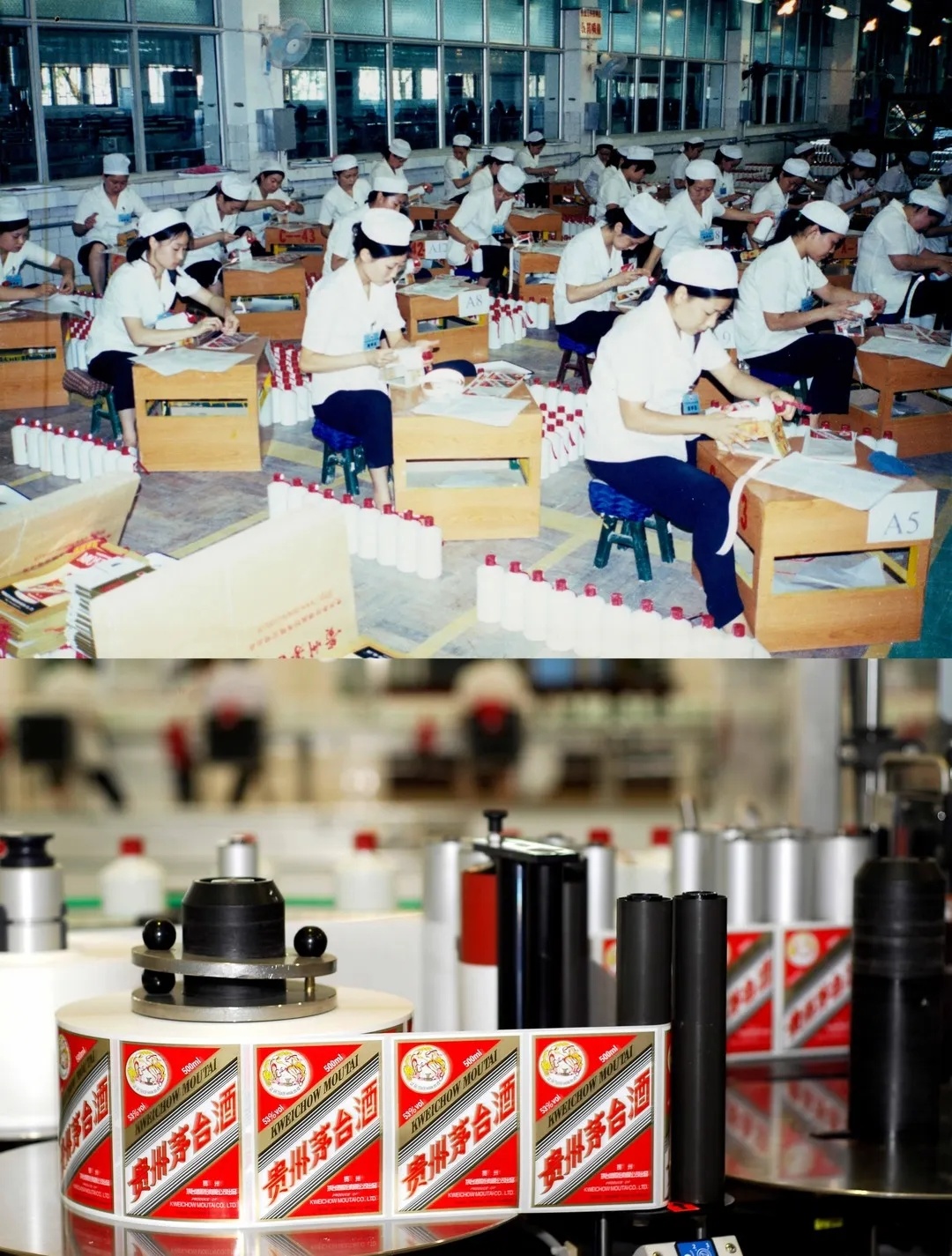 上(shàng)圖為(wèi)20世紀90年代手工貼标包裝場(chǎng)景;下圖為(wèi)當前使用自動貼标機貼标場(chǎng)景。新設備、新技(jì)術(shù)的引進,降低(dī)了工人(rén)的勞動強度,也大(dà)大(dà)提高(gāo)了生(shēng)産效率。