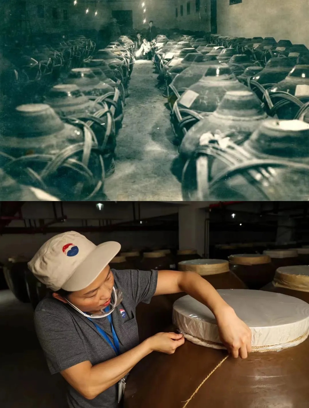 上(shàng)圖為(wèi)20世紀60年代酒庫內(nèi)景;下圖為(wèi)現在酒庫內(nèi)景。同樣使用具有(yǒu)呼吸和(hé)透氣作(zuò)用的陶壇貯存基酒,有(yǒu)助于基酒老熟,變得(de)醇厚、綿柔。