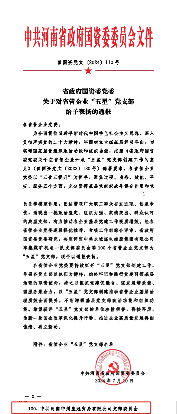 近日,省政府國資委黨委印發《關于對省管企業“五星”黨支部給予表揚的通(tōng)報》,河南鈣源貿易有限公司黨支部被省政府國資委黨委評定為(wèi)“五星”黨支部,并予以通(tōng)報表揚。