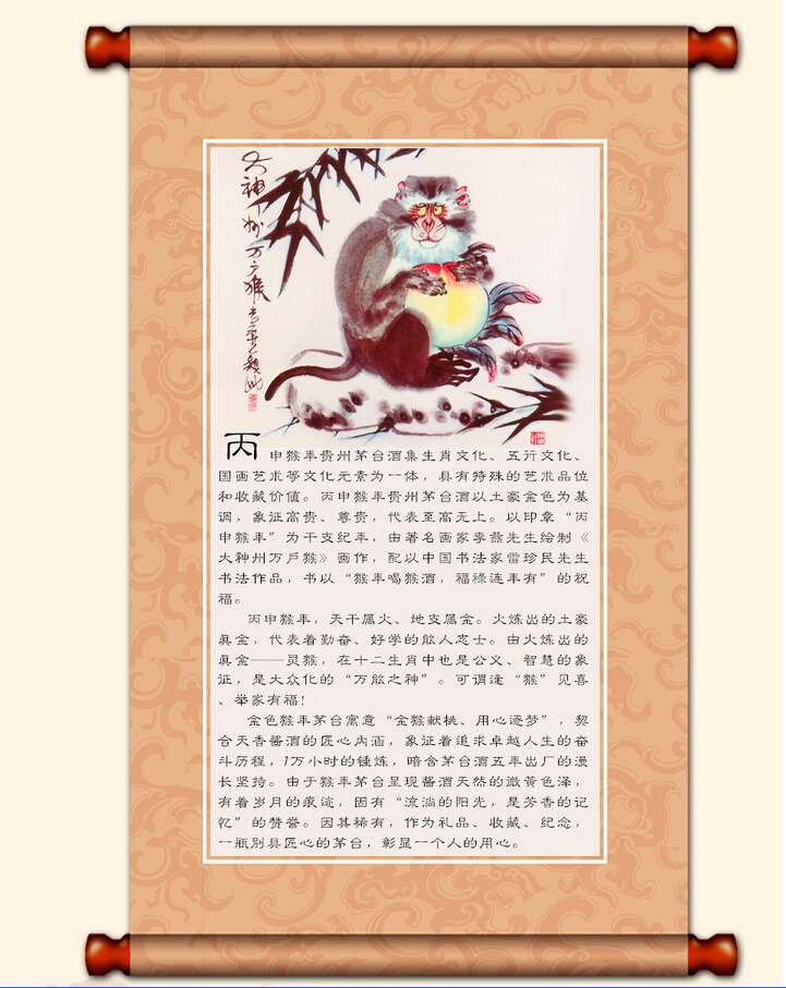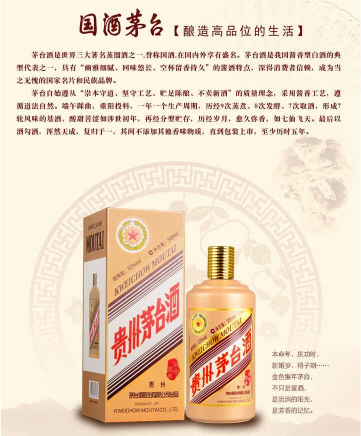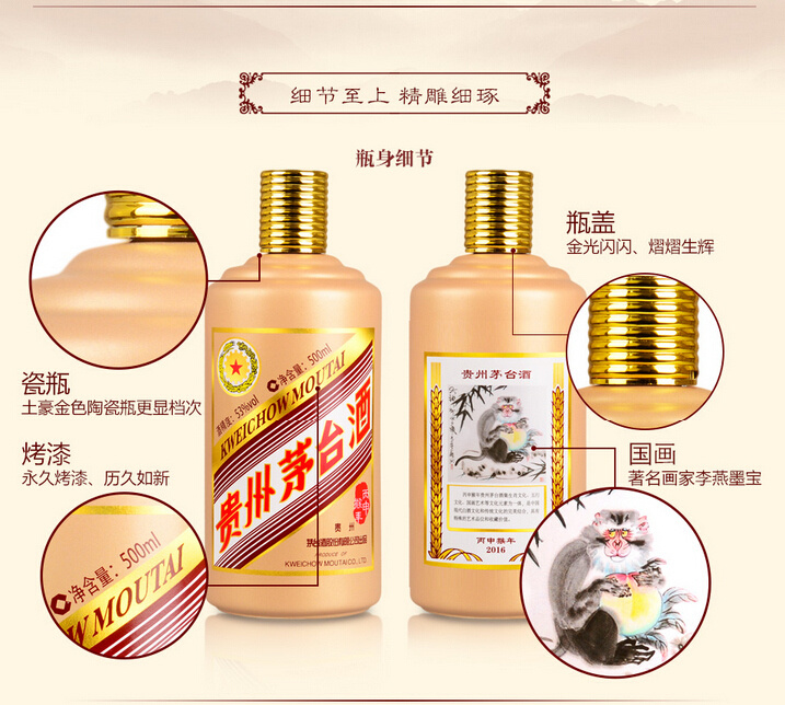 茅台專賣店(diàn)又一新品上(shàng)市,茅台酒新推出的僅在2016年生(shēng)産的丙申猴年紀念酒,售價1299元/瓶,數(shù)量有(yǒu)限。該款酒盒上(shàng)有(yǒu)被國家(jiā)博物館、台北故宮等多(duō)家(jiā)收藏的雷珍民的書(shū)法作(zuò)品,該作(zuò)品以對生(shēng)肖猴的介紹和(hé)“猴年喝(hē)猴酒,福祿連年有(yǒu)”的祝福為(wèi)主題;酒瓶上(shàng)國畫(huà)大(dà)師(shī)李苦禅之子李燕的《獻壽圖》(大(dà)神州萬戶猴)以金猴獻桃的方式祝福國人(rén)新年長壽。